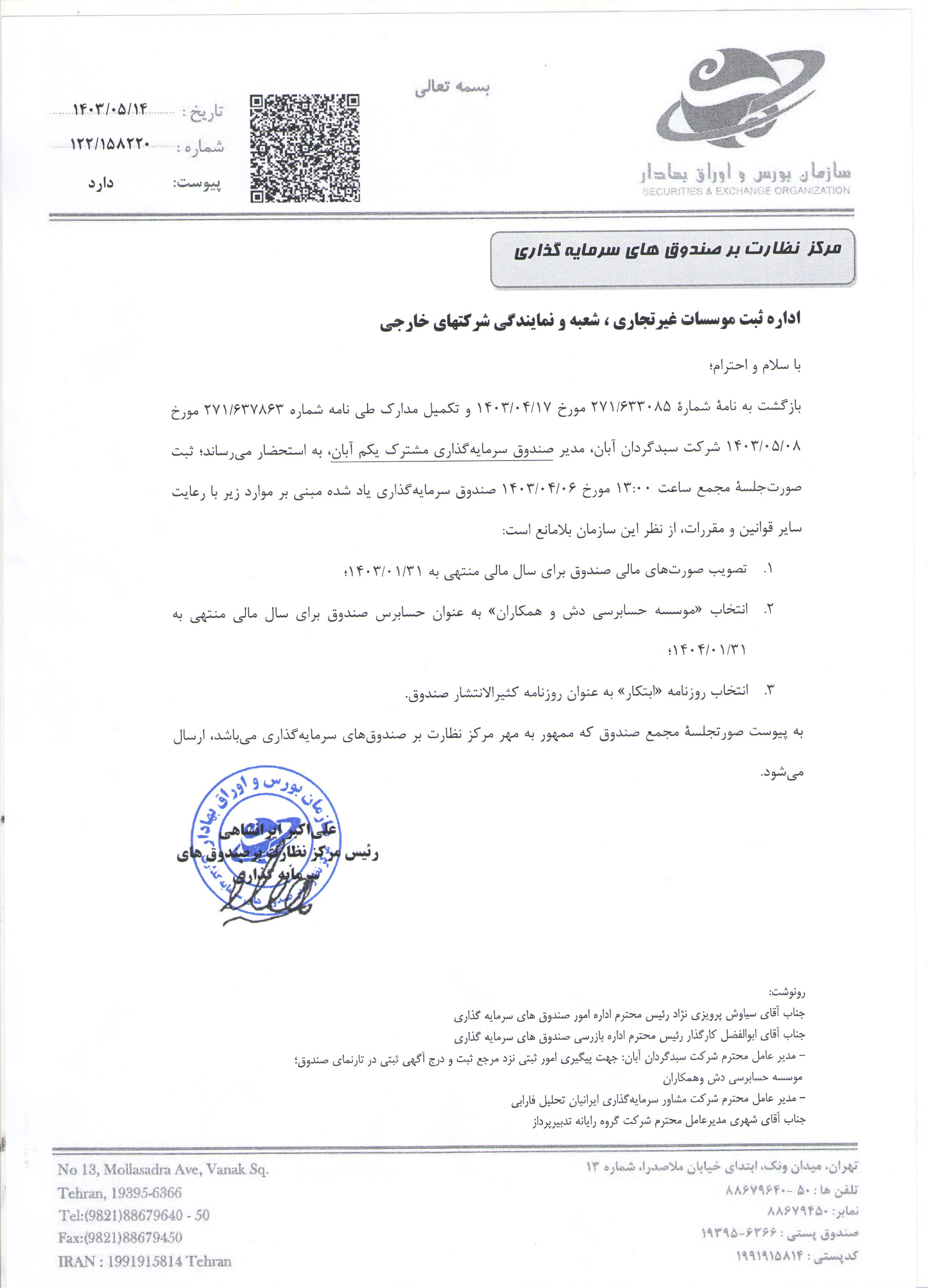 | مقدمه | تاییدیه مجمع صندوق سرمایه گذاری مشترک یکم آبان با موضوع تصویب صورت های مالی منتهی به 1403/01/31 مورخ 1403/04/06 |